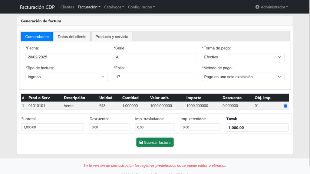 ¿Necesitas una solución confiable y eficiente para generar facturas electrónicas en México? Nuestro Sistema de Facturación Electrónica CFDI 4.0 está diseñado para ayudarte a cumplir con las regulaciones del Servicio de Administración Tributaria (SAT) de manera sencilla y segura. Con esta plataforma, podrás ahorrar tiempo, reducir costos y evitar errores en tu facturación, mientras te mantienes al día con las normativas fiscales vigentes.